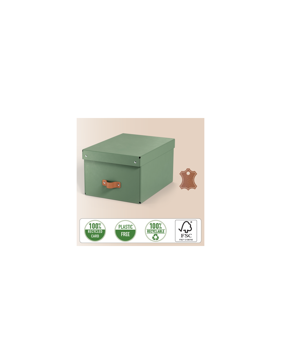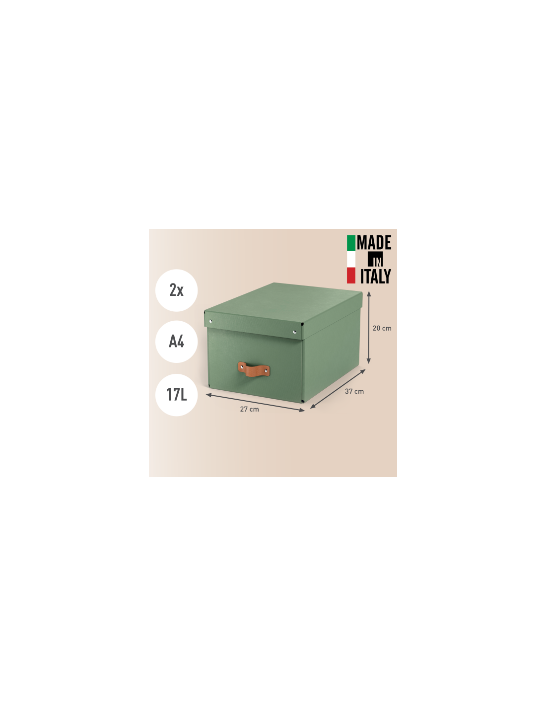 Leitz 61490050. Material: Cartón, Color del producto: Verde, Formato: A4. Volumen: 17 L, Ancho: 270 mm, Altura: 200 mm. Cantidad por paquete: 2 pieza(s). País de origen: Italia. Certificados de sostenibilidad: Forest Stewardship Council (FSC)