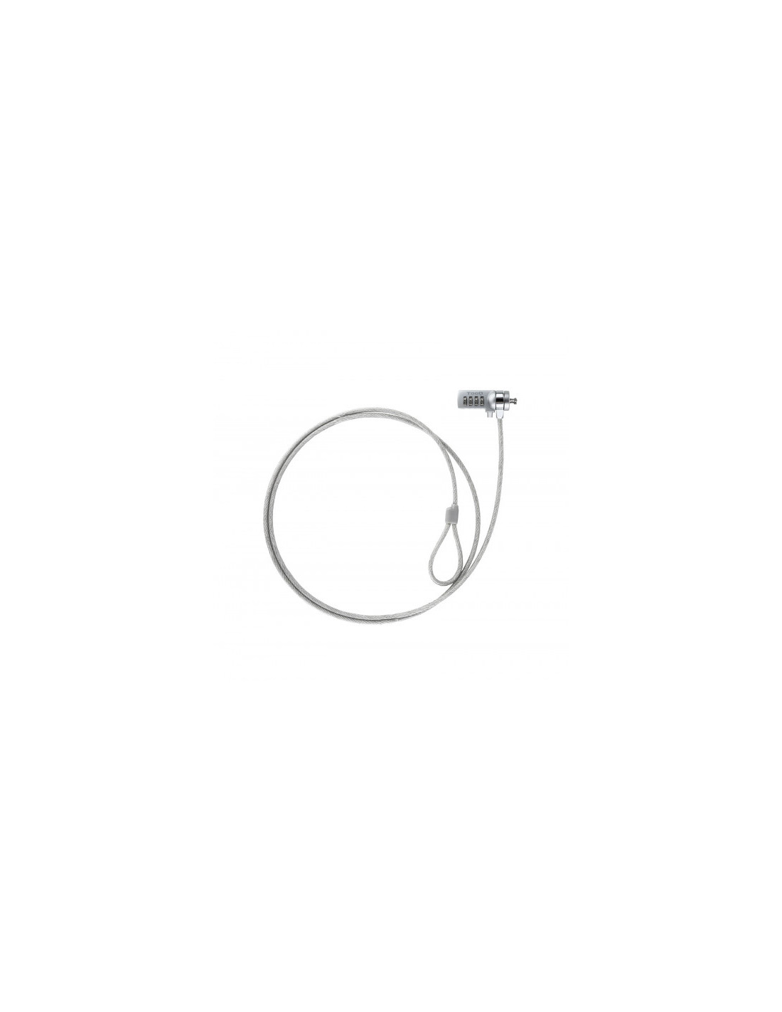 Cable de seguridad con combinación para portátiles 1.5 metros\n\nEspecificaciones\n- Universal y fácil de usar\n- Cable de acero de 1.5 metros de longitud y 4.5mm de diámetro\n- Bloqueo con combinación de 4 dígitos\n- Válido para pantallas y dispositivos con ranura de seguridad tipo Kensington\n- Material del candado: acero galvanizado con revestimiento de vinilo transparente y llave de aleación de zinc\n- Color: Plata\n- Peso neto: 0,14 kg. Peso bruto: 0,15 kg\n- Medidas del embalaje: 210x150x30 mm\n\nContenido del Paquete\n- 1 x Cable candado