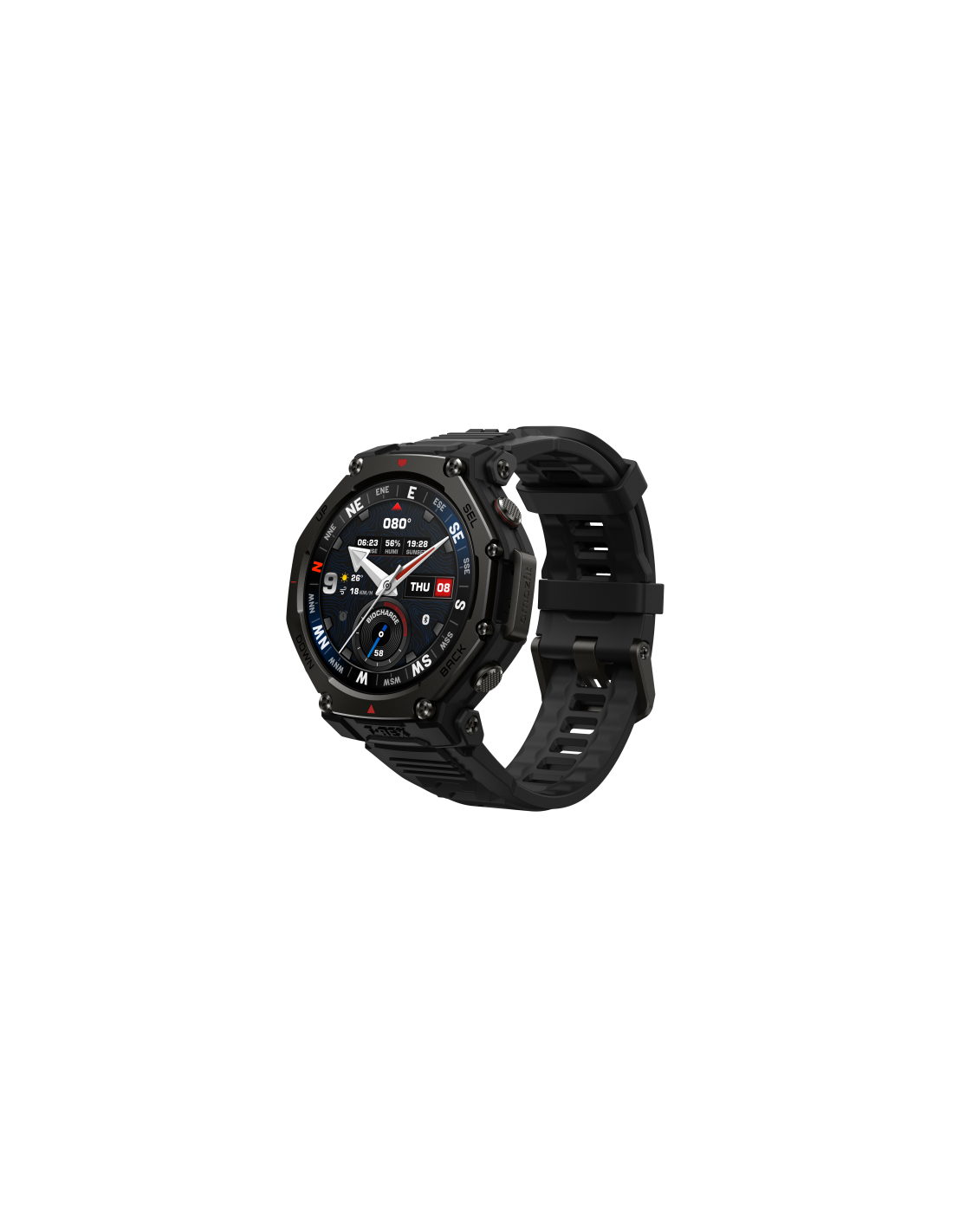 Amazfit T-rex 3 Pro. Diagonal de la pantalla: 3,35 cm (1.32"), Tecnología de visualización: AMOLED, Resolución de la pantalla: 466 x 466 Pixeles, Pantalla táctil. Capacidad de RAM: 64 MB, Memoria flash: 16 GB. Wifi. GPS (satélite). Capacidad de batería: 640 mAh. Peso: 46,8 g. Humedad: resistente al agua hasta: 45 m, Material de la banda: Silicona, Color de banda: Negro