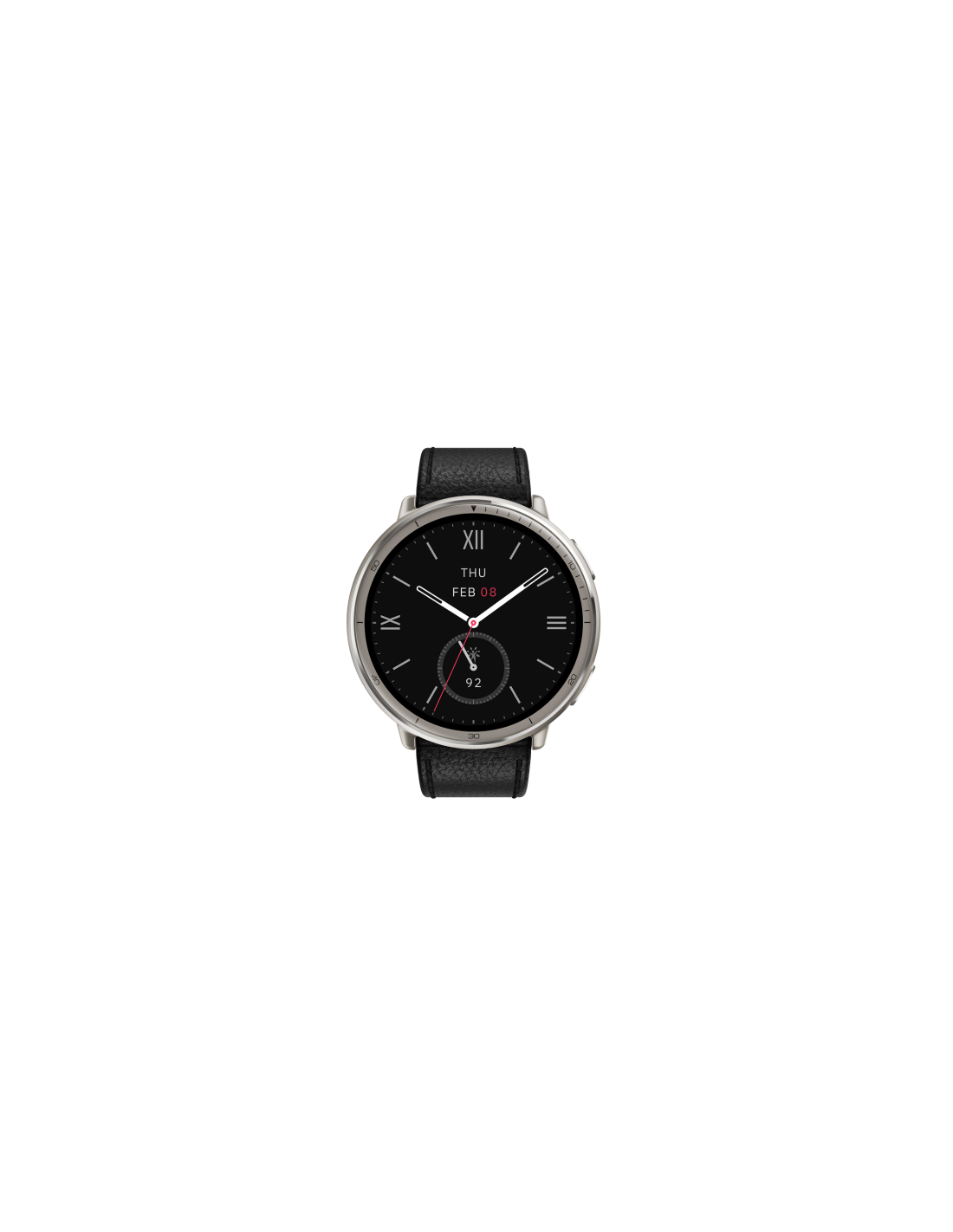 Amazfit W2433EU1N. Diagonal de la pantalla: 3,35 cm (1.32"), Tecnología de visualización: AMOLED, Resolución de la pantalla: 466 x 466 Pixeles, Pantalla táctil. Capacidad de batería: 270 mAh. Peso: 29,5 g. Material de la banda: Cuero, Color de banda: Negro. Sistema operativo instalado: Zepp OS