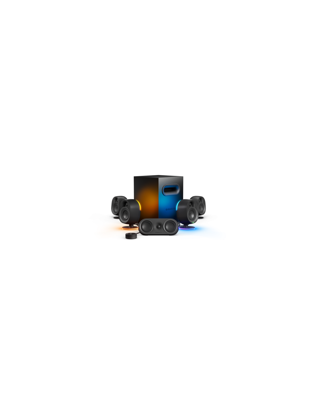Verdadero sonido envolvente 5,1 que incluye un subwoofer de 6,5" para juegos inmersivos a través de una sola conexión USBDos altavoces traseros inalámbricos para conectividad entre la parte delantera y trasera de la habitación sin cablesPaisaje sonoro robusto y preciso con un diseño de altavoz de dos vías, con woofers de fibra orgánica y tweeters de cúpula de sedaAltavoces iluminados con 16,8 millones de colores RGB que reaccionan a la acción y la música en pantallaConéctese fácilmente a PC, PlayStation y Mac y más con USB, Bluetooth, óptico o auxiliar de 3,5 mm y auriculares con cablePantalla OLED informativa con controles de volumen, 5,1 Upmix, cambio de auriculares, controles LED, emparejamiento BT, EQ y funciones del sistemaPersonalice el audio con el ecualizador paramétrico de 10 bandas con cancelación de eco acústico del software Sonar y más