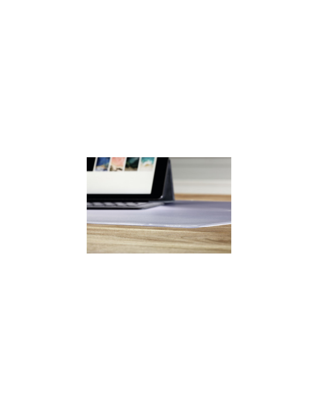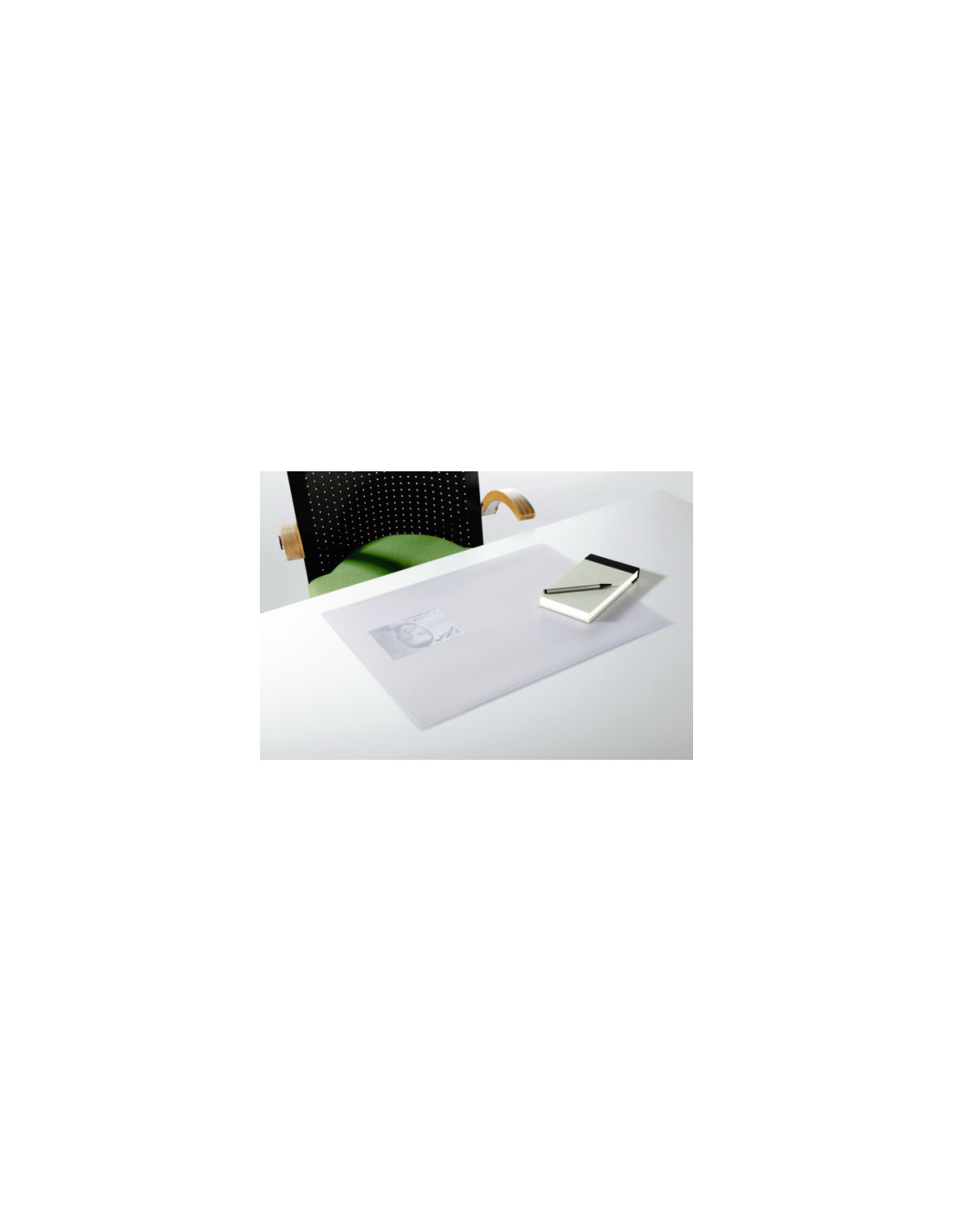 Uit PVC. Transparante, elastische onderlegger met een spiegelvrije folie waaronder notities, telefoonlijsten, enz. kunnen geschoven worden. ft 40 x 53 cm (h x b)