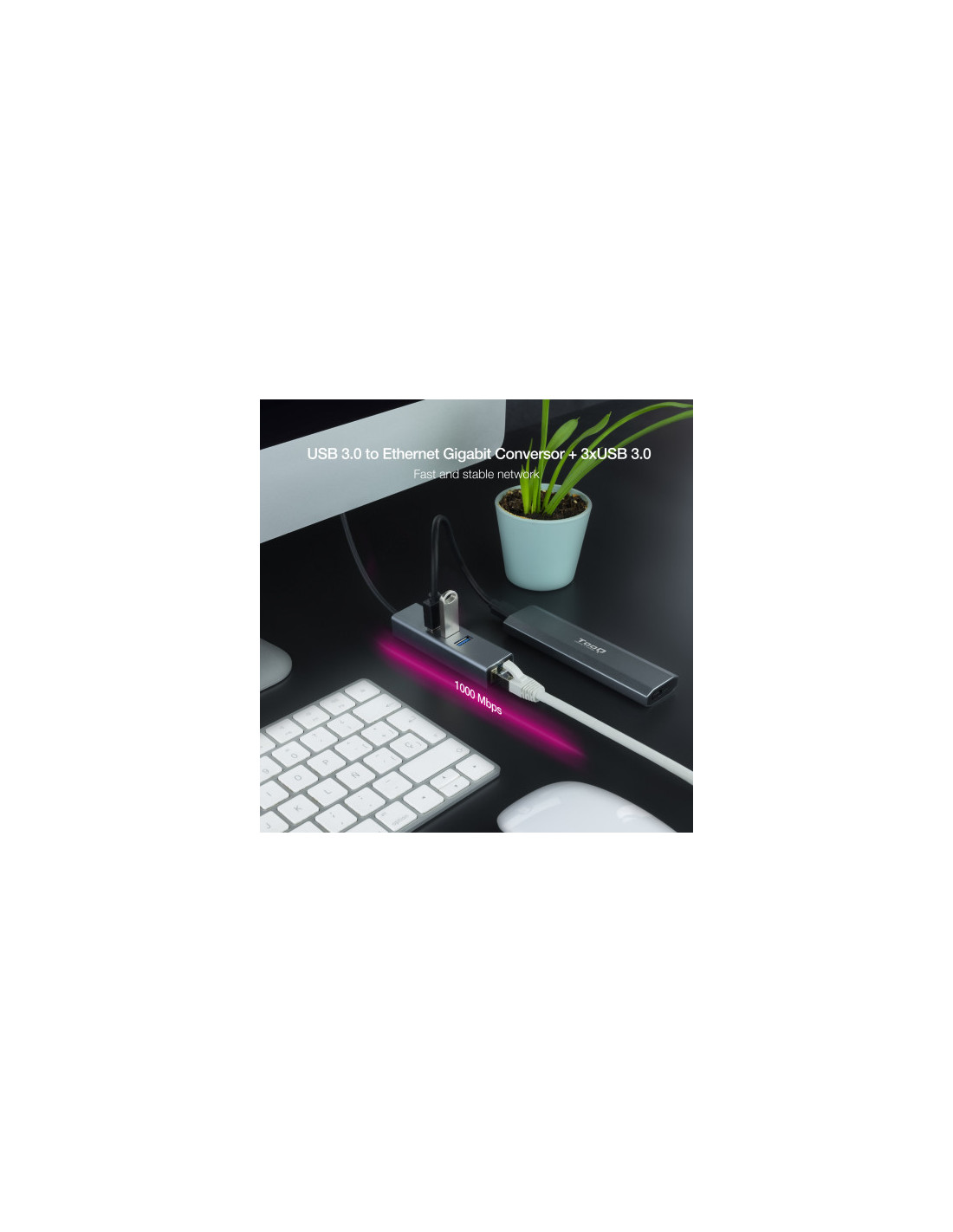 Conversor USB 3.0 a Ethernet Gigabit con 3 puertos USB 3.0, con conector USB 3.0 macho en un extremo, conector RJ45 hembra y 3 puertos USB 3.0 hembra en el otro.