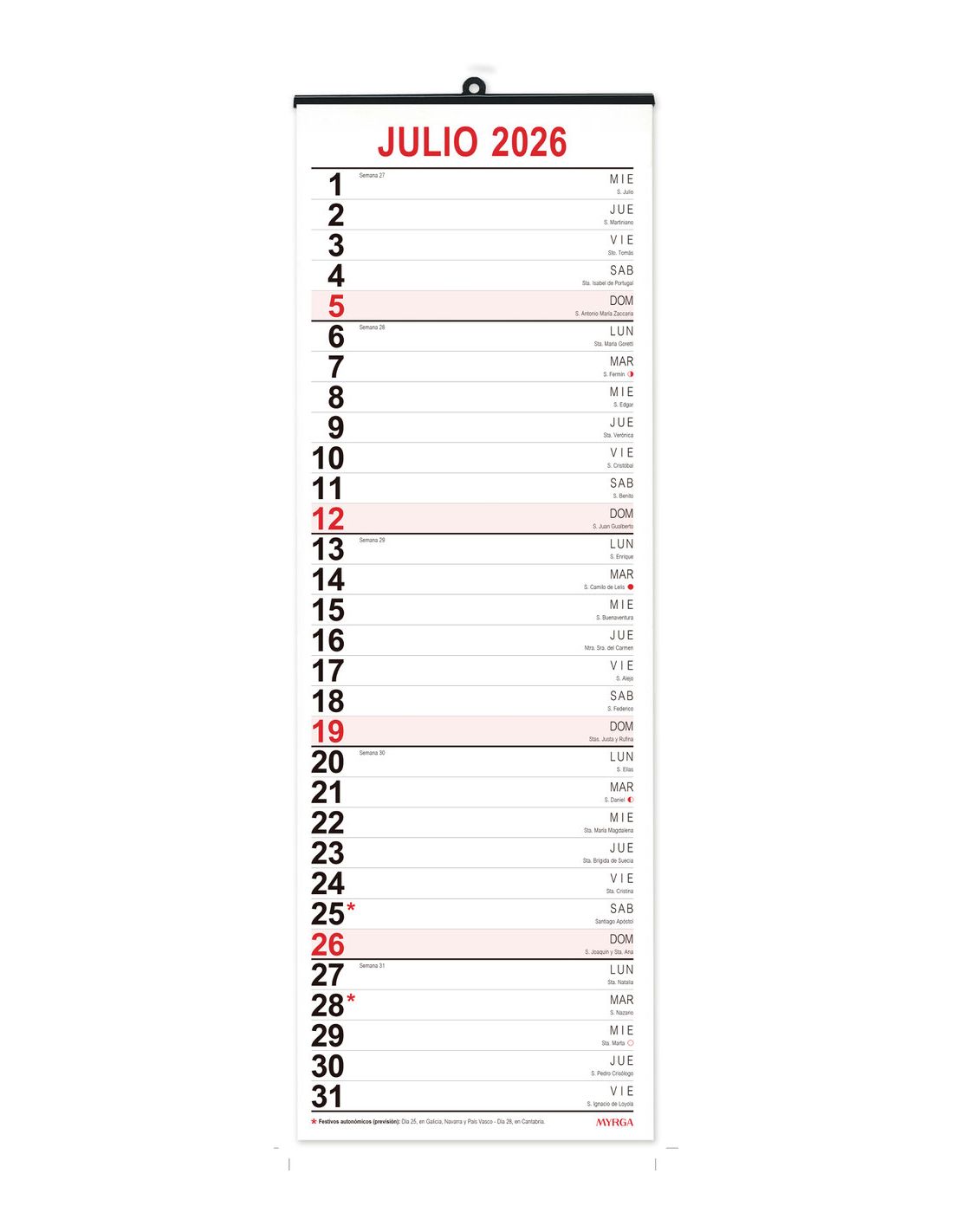CALENDARIO PLANNING MENSUAL 2026 VERTICAL 16,5X49CM MYRGA REF:1596