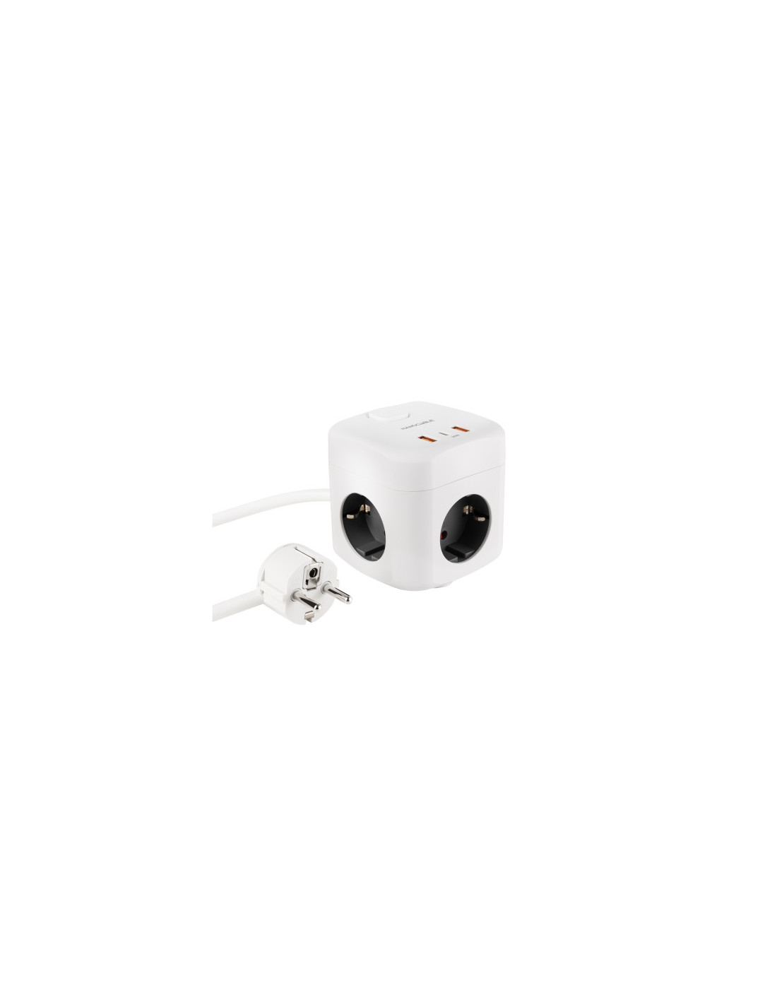 Regleta compacta en formato cubo con 3 enchufes de 16A y 3 puertos USB (2x USB-A + 1x USB-C). Incluye base de sujeción y cinta adhesiva 3M para montaje en pared o escritorio.
