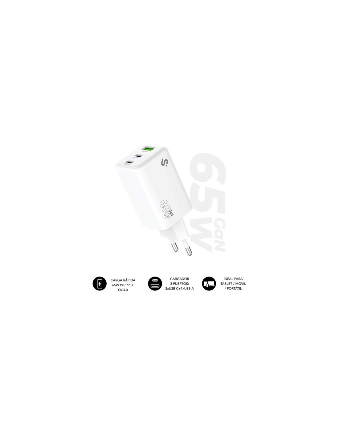 Cargador GaN 65 W SUBBLIM, 2 × USB-C + USB-A PD 3.0 & PPS, 45 W + 20 W simultáneos para MacBook Air/ProSUBBLIM presenta su cargador GaN de 65 W con dos puertos USB-C y un USB-A, el todoterreno que sustituye a todos tus adaptadores sin ocupar espacio en la mochila. Potencia profesional en tamaño de bolsillo USB-C 1 (65 W): hasta 20 V ⎓ 3,25 A, ideal para portátiles ligeros como MacBook Air/Pro 13′′, Dell XPS 13, Surface Go o Chromebooks USB-C.USB-C 2 (20 W): perfecto para iPad Pro/Air, Galaxy Tab S9 o Pixel Tablet. USB-A (18 W, QC 3.0): mantiene cargados iPhone, auriculares, altavoces BT o un segundo móvil. Carga tres dispositivos a la vez con repartos inteligentes: 45 W + 20 W, 45 W + 18 W o 45 W + 15 W, sin sobrecalentarse ni bajar el ritmo.