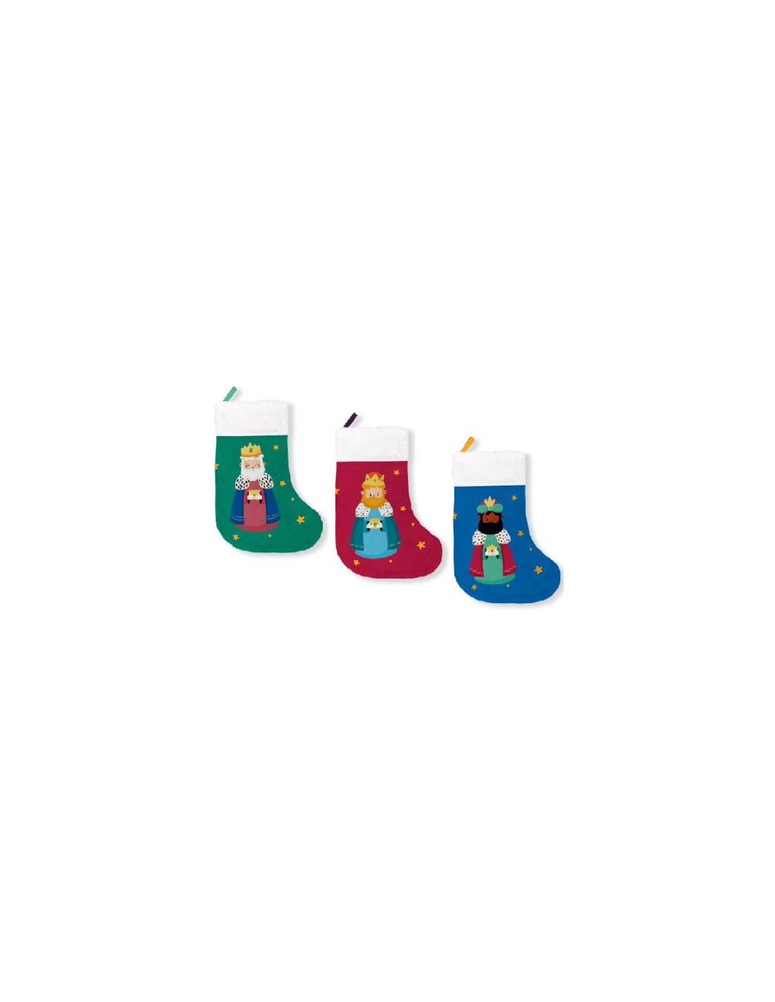 Pack 3 calcetines colgantes con cada rey mago impreso. Material fieltro , con cinta colgante. Medida 28x12 cm.