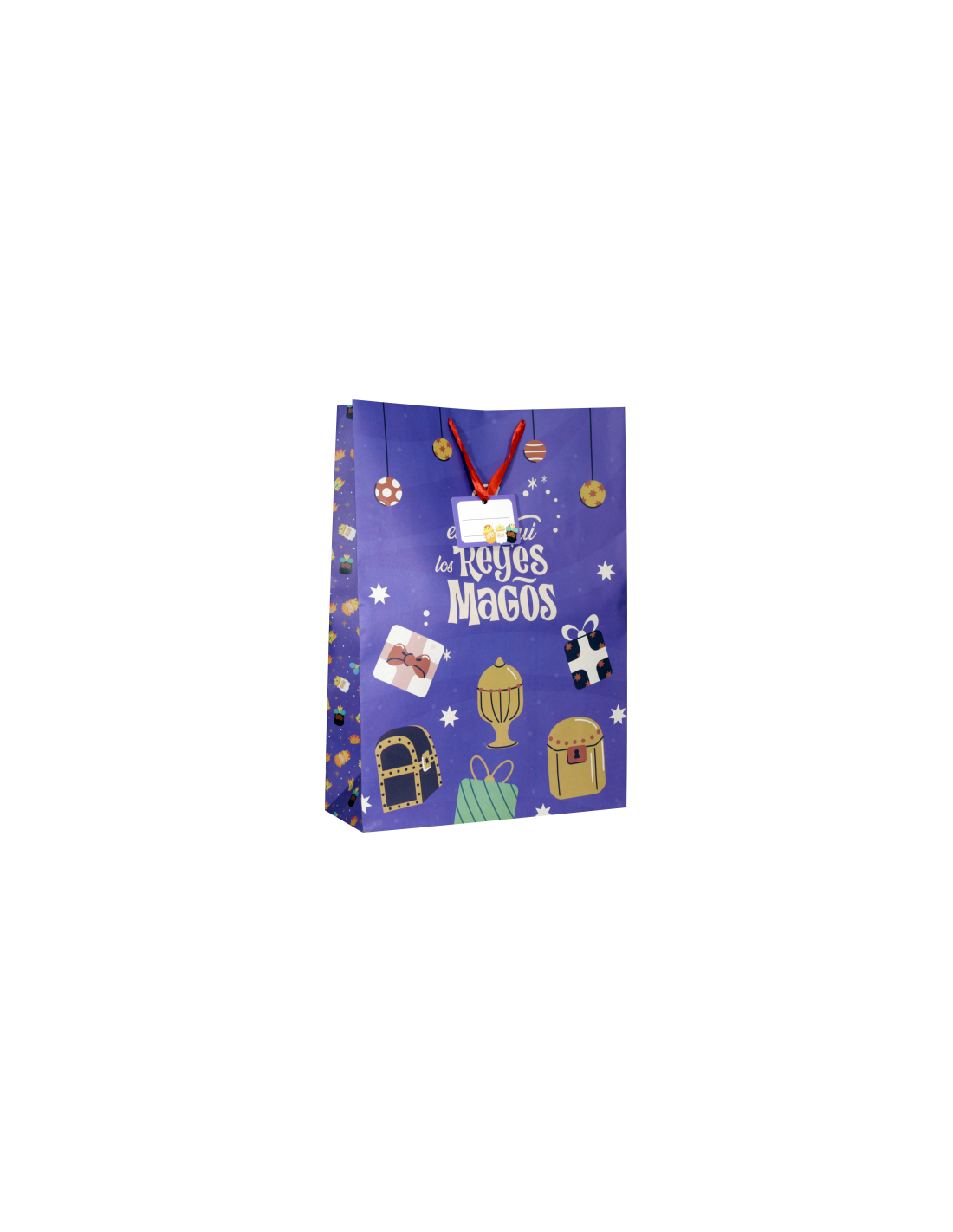 Divertida Bolsa con motivos de reyes Mayos Su gran tamaño nos permite su uso para juguetes especiales o para dejarlos debajo del arbol como saco .Impresión en ambas caras. Material papel kraft. Dispone de asas con lazo así como una tarjeta para para personalizar de medidas 12x9 cm.