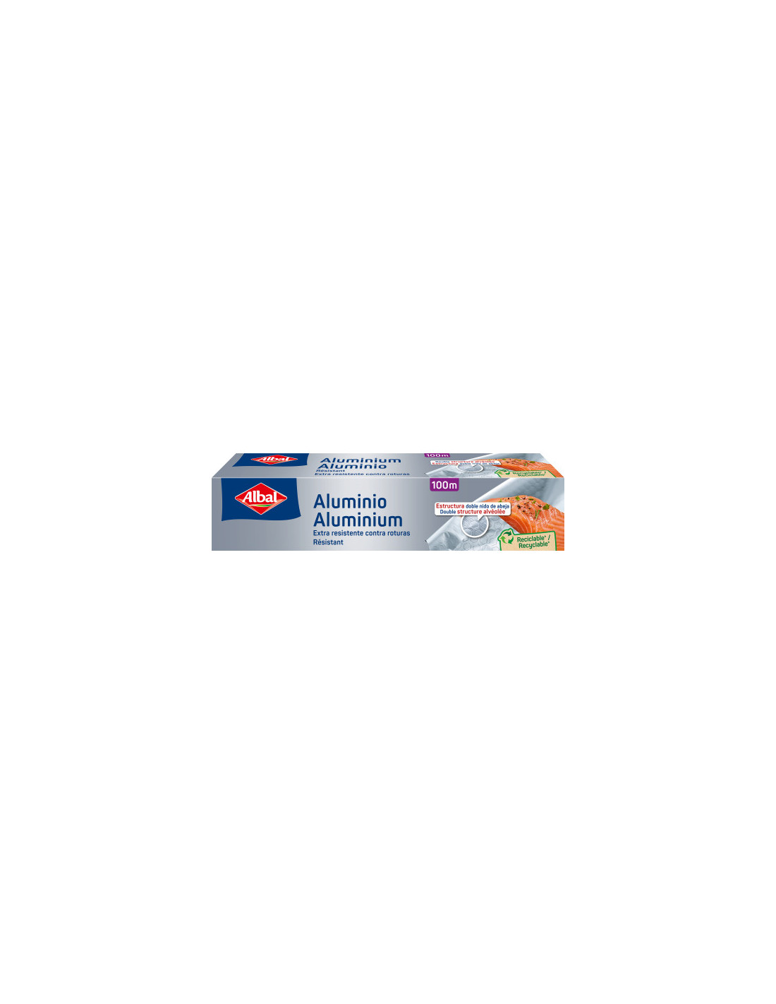 Rollo de papel de aluminio Albal de 100 metros. Resistente y versátil, ideal para conservar alimentos, cocinar al horno y proteger superficies.