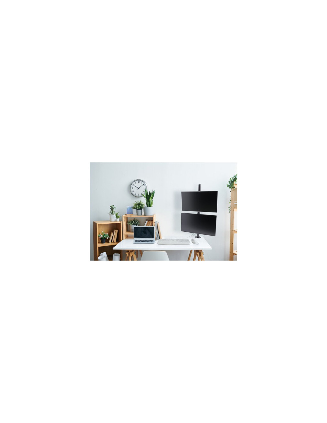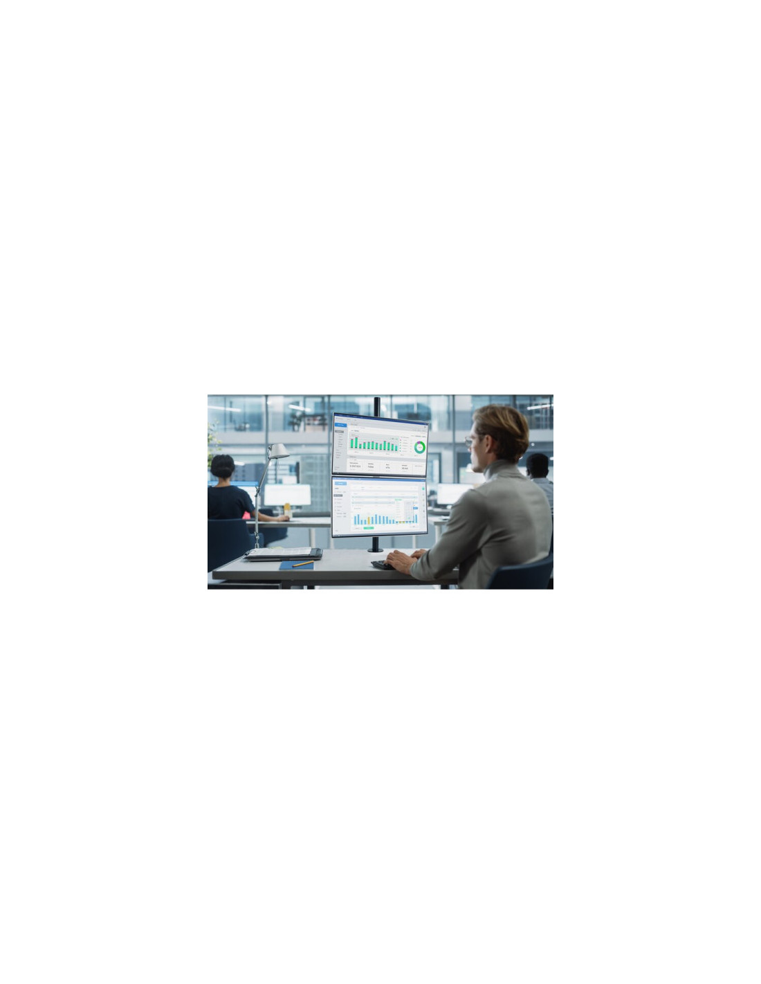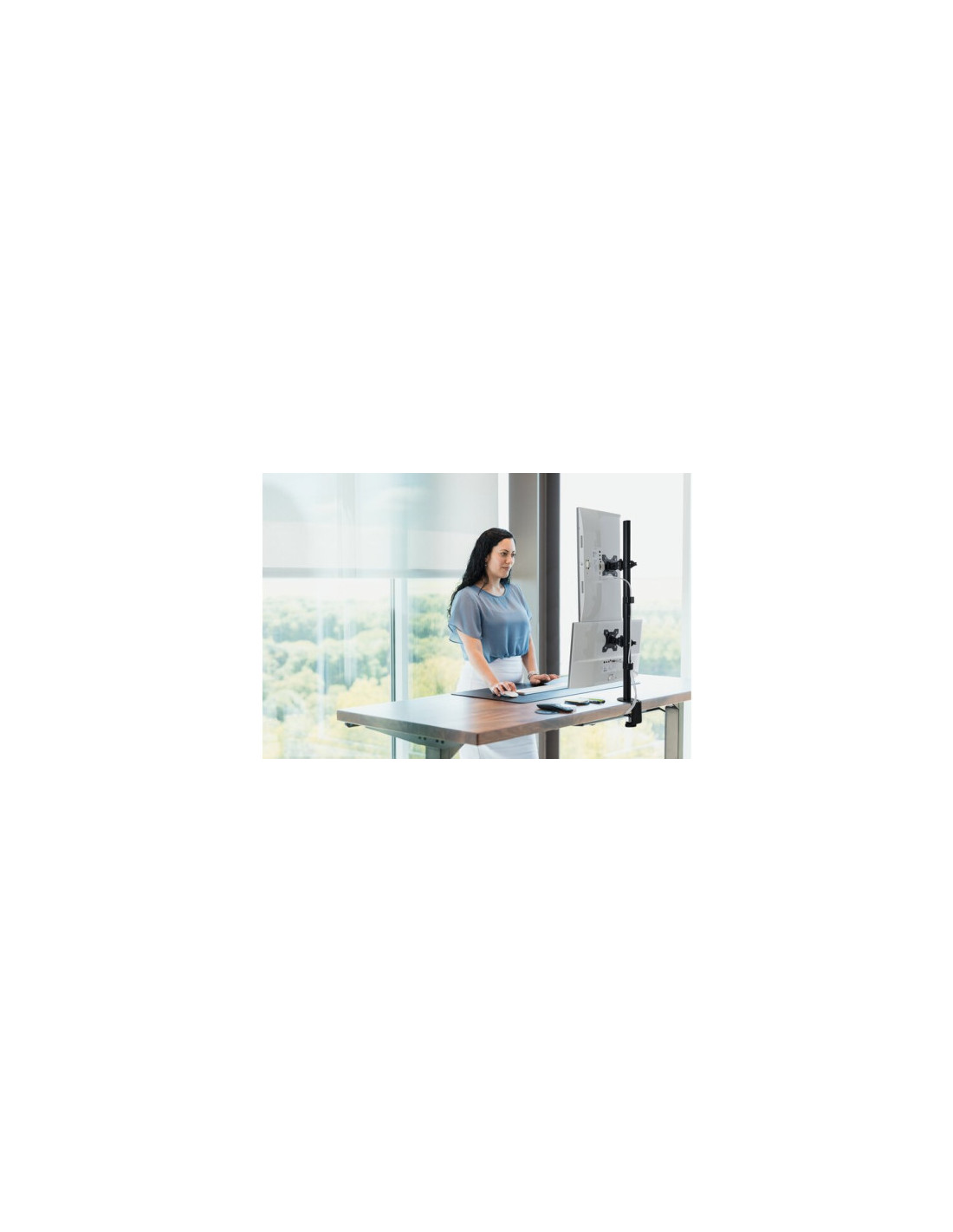 El Brazo vertical para dos monitores ofrece la capacidad de posicionar dos monitores (de hasta 32 y 9 kg/19,8 lb cada uno) en vertical de forma estable y segura, todo ello mientras maximiza el espacio de trabajo. Ideal para juegos, navegar por sitios web, salas de control o sitios con espacio limitado en el escritorio. El asa de liberación rápida permite ajustar la altura del monitor de forma suave y sin esfuerzo. Es fácil de instalar y de usar, y cuenta con un diseño de movimiento completo que permite posicionar el monitor en cualquier dirección. Las placas VESA® 75/100 desmontables y giratorias en ±180°, así como la abrazadera en C (incluido el soporte de ojal opcional), proporcionan una plataforma estable y segura fácil de instalar. Opción de gestión de cables integrada para reducir el desorden.