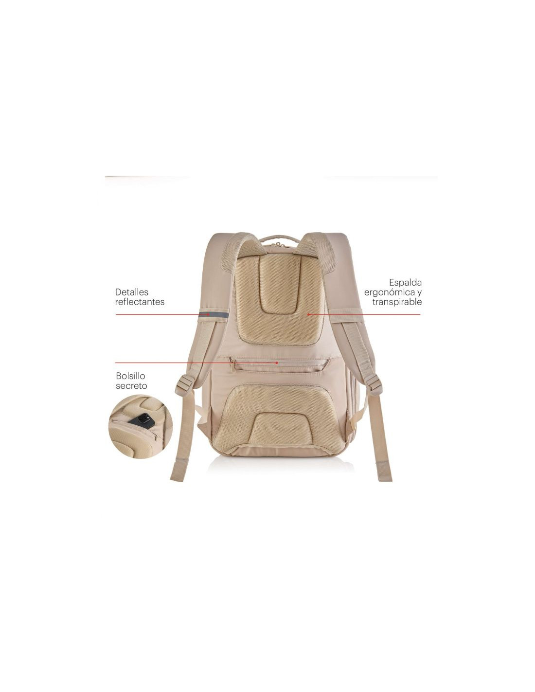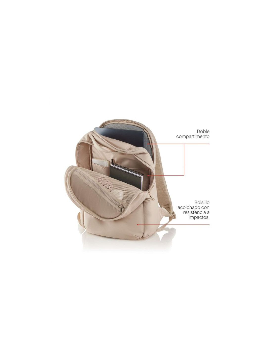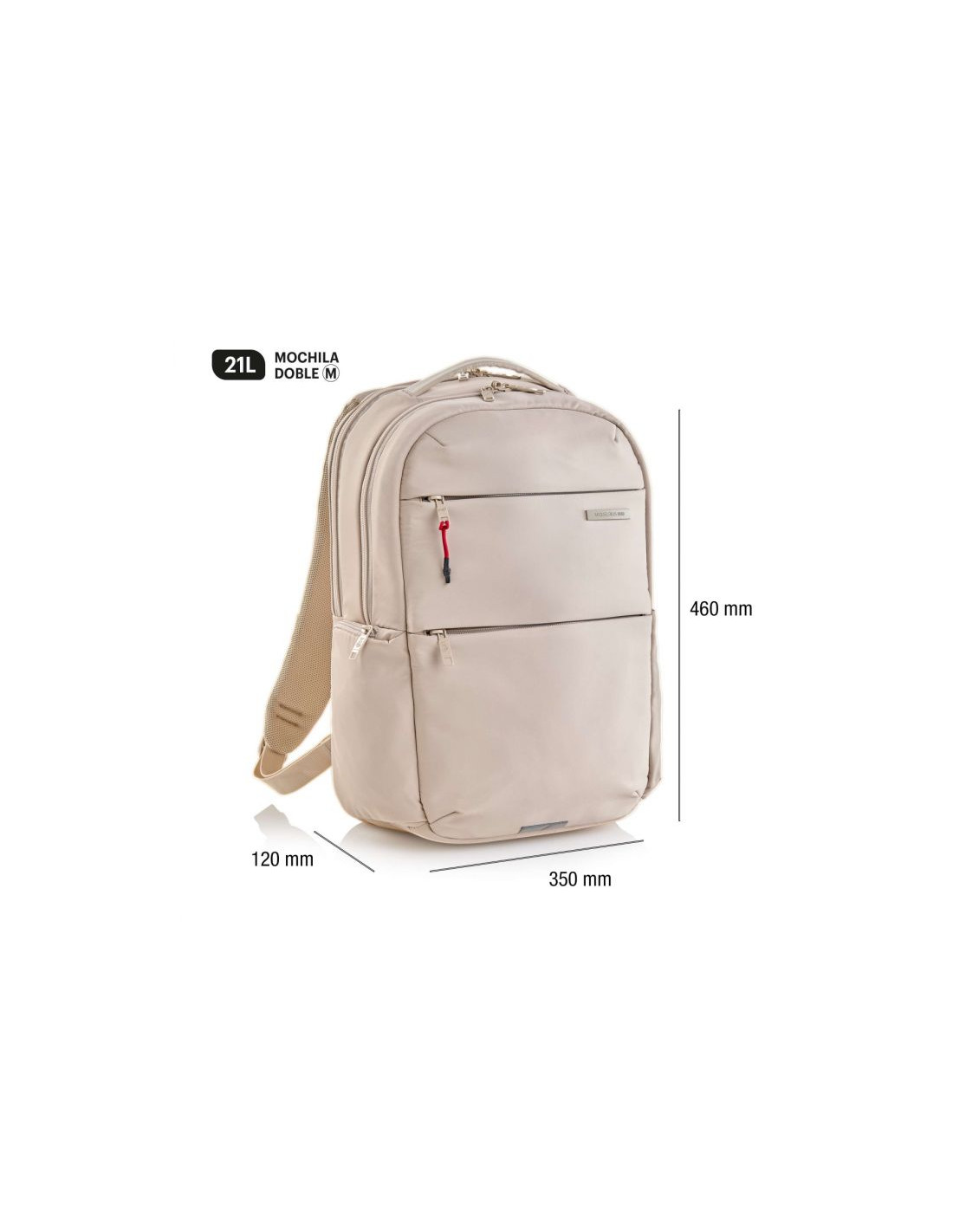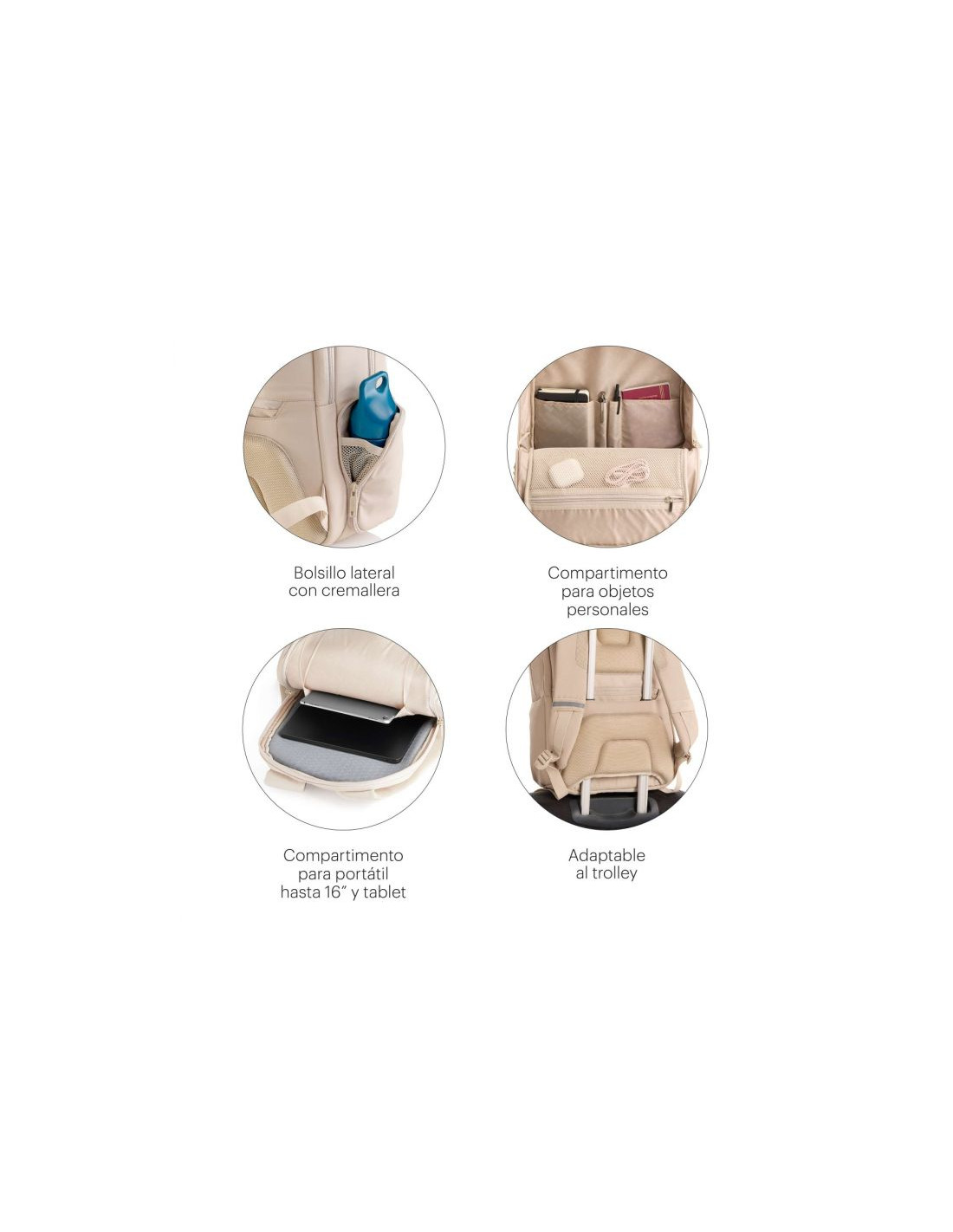 Mochila Mediana Beige Bag To Work. 350 x 460 x 120 mm. Mochila ligera y a la vez con capacidad para llevar todo lo necesario para el trabajo. Con múltiples bolsillos y compartimentos, permite una perfecta organización de los objetos personales. Material: Poliéster de alta calidad con tejido sarga, que ofrece mayor resistencia y durabilidad, además de un acabado extra suave y repelente al agua. Bolsillo de gamuza para objetos delicados. Material repelente al agua. Bolsillo organizador y con llavero. Doble compartimento. Bolsillo acolchado con resistencia a impactos. Detalles reflectantes. Espalda ergonómica y transpirable. Bolsillo secreto. Bolsillo lateral con cremallera. Compartimento para objetos personales. Compartimento para portátil hasta 16” y tablet. Adaptable al trolley