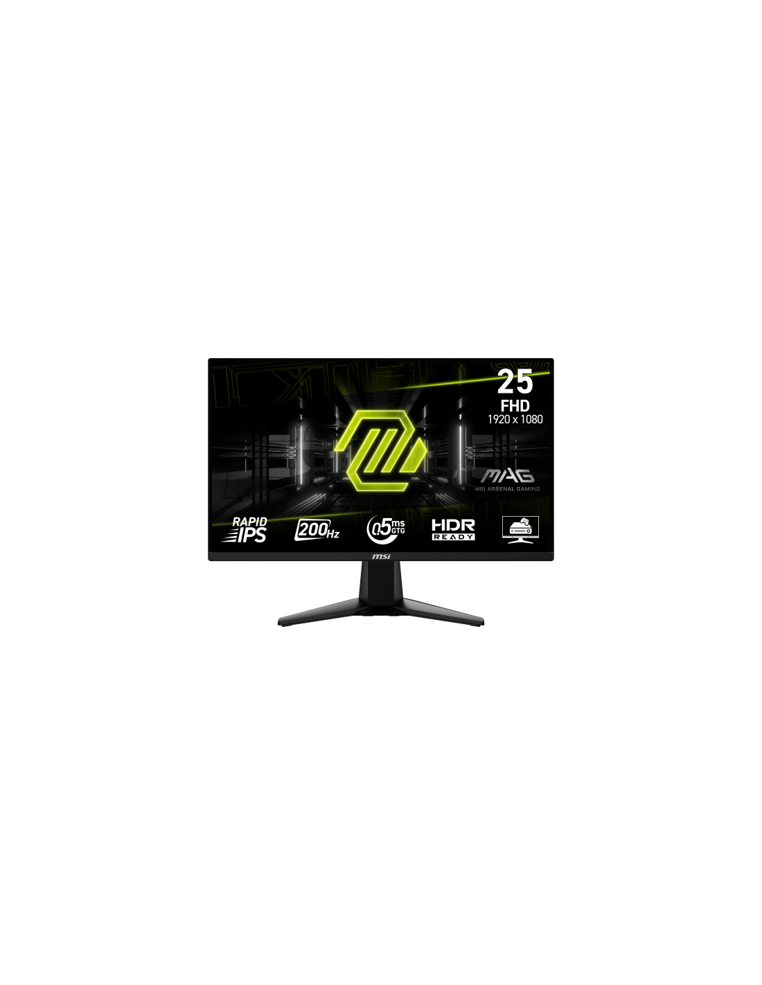 MSI MAG 255F E20. Diagonal de la pantalla: 62,2 cm (24.5"), Resolución de la pantalla: 1920 x 1080 Pixeles, Tipo HD: Full HD, Tecnología de visualización: LCD, Tiempo de respuesta: 0,5 ms, Relación de aspecto nativa: 16:9, Ángulo de visión, horizontal: 178°, Ángulo de visión, vertical: 178°. montaje VESA. Color del producto: Negro