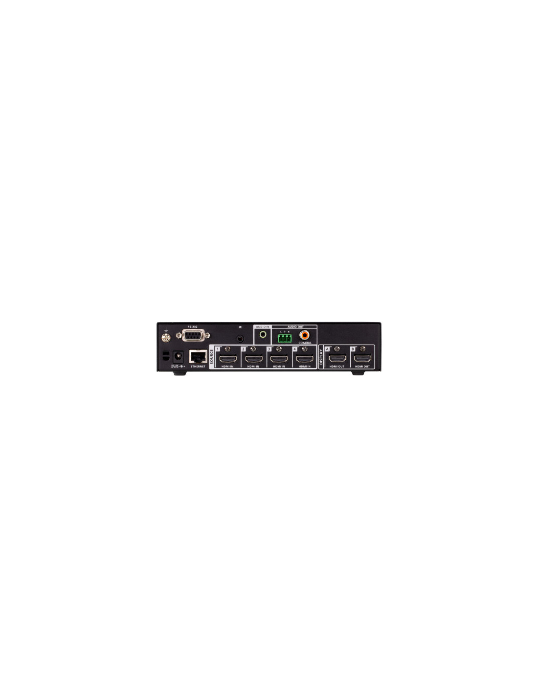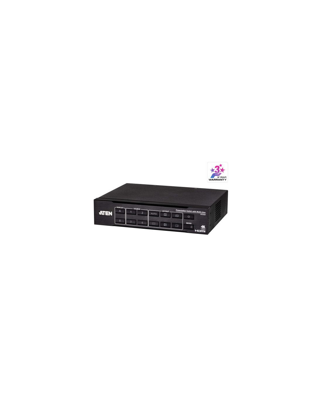ATEN VP2420. Tipo de producto: Matriz de conmutación de presentación multimedia, Máxima resolución: 4096 x 2160 Pixeles, Resolución máxima (HDMI): 4096 x 2160 Pixeles. Color de la carcasa: Negro, Material de la carcasa: Metal, Tipo de control: Botones. Consumo energético: 17,1 W. Ancho: 160,5 mm, Profundidad: 200 mm, Altura: 44 mm