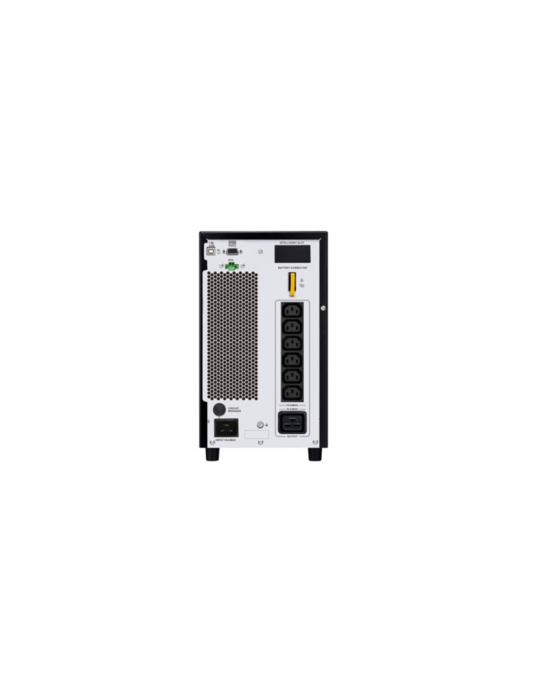 APC SRV3KI-E. Topología UPS: Doble conversión (en línea), Potencia de salida: 2700 W, Forma de onda: Seno. Tipo de salida AC: C13 acoplador, Conector: C19 acoplador. Tecnología de batería: Sealed Lead Acid (VRLA), Voltaje de la pila: 72 V, Tiempo de recarga de la batería: 4 h. Color del producto: Negro, Longitud de cable: 1,5 m, Tipo de visualizador: LCD. Ancho: 190 mm, Profundidad: 425 mm, Altura: 336 mm