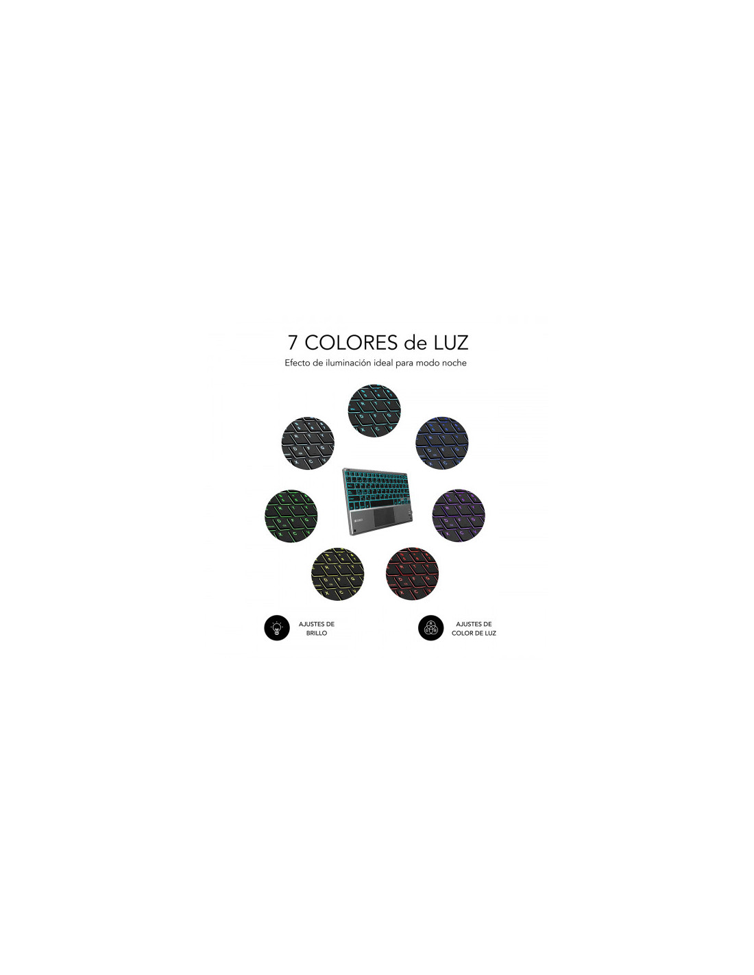 Ya puedes trabajar como un profesional y obtener el máximo rendimiento de tu Tablet gracias a este Teclado Bluetooth de última generación que incorpora TouchPad ultrapreciso y teclas retroiluminadas. Navega por tu Tablet con los movimientos y gestos que ya conoces o mueve el puntero para editar fácilmente documentos o presentaciones.La batería de Litio de larga duración que incorpora el Teclado Bluetooth te permitirá trabajar durante largos periodos de tiempo y la puedes recargar mediante el puerto MicroUSB.Teclado retroiluminadoDispone de 7 colores para que elijas el que más se adapta a tus necesidades en función de la iluminación ambiental. Puedes controlar tanto el brillo como el color con dos teclas exclusivas para elloTouchPad10 funciones especiales con movimientos con uno, dos y tres dedos: desplazar el puntero, scroll vertical y horizontal, pulsar, Zoom, visualizar app, ir a la ultima app, mostrar el menú o el escritorio, ir hacia adelante o atrás.Diseño Ultra-DelgadoDiseño compacto y elegante con solo 6mm de grosor que permite el uso en cualquier espacio y momento. Cabe fácilmente en un bolso, maletín o mochila... e incluso entre las páginas de una revista. Es tan ligero que hasta podrías olvidar que lo llevas contigo.Teclas de Alta PrecisiónSu tecnología de membrana en tijera, está pensada para obtener la máxima eficiencia en cada pulsación, estabilidad y precisión. La teclas son planas de tipo Chiclet para una escritura cómoda y silenciosa.Batería Li-ion RecargableCuando el indicador LED te indique que el nivel de batería es bajo, conecta tu dispositivo por USB a una fuente de corriente y sigue usando tu teclado mientras se recarga gracias a su Batería de Li-ion de larga duraciónAhorro de EnergíaDespués de unos minutos de inactividad, pasará automáticamente al modo suspensión para conservar las baterías. Simplemente presione cualquier tecla y espere 2-3 segundos para volver a activarloConector BT y Encendido
