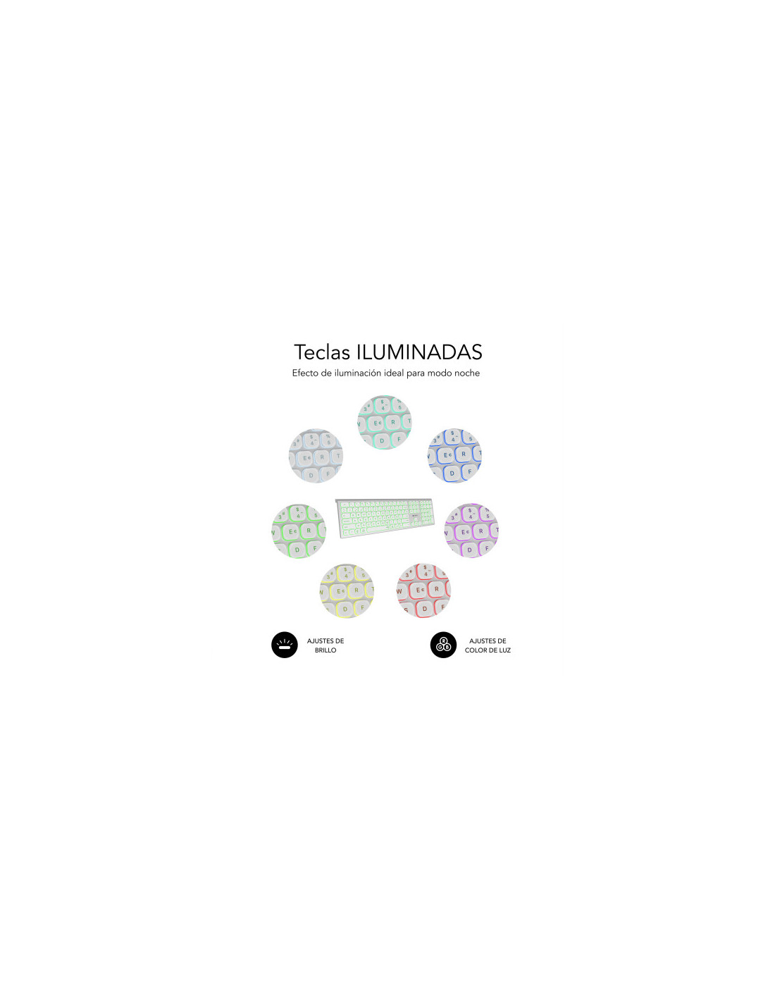 Completa tu espacio de escritorio moderno, mientras trabajas de forma remota o desde casa, con el teclado retroiluminado Bluetooth SUBBLIM Master. Diseñado para dispositivos con sistemas Mac/iOS, Windows o Android, el teclado Master cuenta con un diseño ampliado con teclado numérico, Bluetooth y 2.4G multidispositivo y teclas de acceso directo optimizadas para varios sistemas, todo con un diseño ultradelgado y moderno. Equipado con teclas cóncavas retroiluminadas ajustables y un puerto USB-C recargable, el teclado permite trabajar con facilidad donde y cuando te lleve tu creatividad.Teclas silenciosas de bajo perfil con forma cóncava. El mecanismo de tijera de las teclas hace que escribir sea cómodo y muy receptivo. El ángulo del teclado proporciona soporte para la muñeca para un trabajo sin dolor durante largos períodos de tiempo. El mouse silencioso y su clic muy suave garantizan un ambiente tranquilo y sereno.Teclado Iluminado. Dispone de 7 colores para que elijas el que más se adapta a tus necesidades en función de la iluminación ambiental. Puedes controlar tanto el brillo como el color con dos teclas exclusivas para ello.Triple conexión. El teclado Master de SUBBLIM es ideal si deseas disfrutar de la libertad de trabajar con varios dispositivos a la vez. Su funcionalidad de emparejamiento triple le permite conectar hasta tres dispositivos al teclado, dos mediante tecnología inalámbrica Bluetooth 5.2 y otro mediante radio frecuencia 2.4G. Podrás conectar de forma simultánea el Ordenador portátil, el teléfono móvil y la Tablet cambiando entre ellos de una forma muy sencilla.Práctico Control. Con doce teclas de funciones multimedia*, tendrás accesos directos a tus funciones favoritas al alcance de tu mano. Cambia fácilmente entre las funciones más utilizadas para cada sistema operativo, ya sea a tu PC con Windows, iPhone o dispositivo Android. Tendrás acceso rápido a los controles del dispositivo para iOS y Android, como el botón de inicio, activar la función de