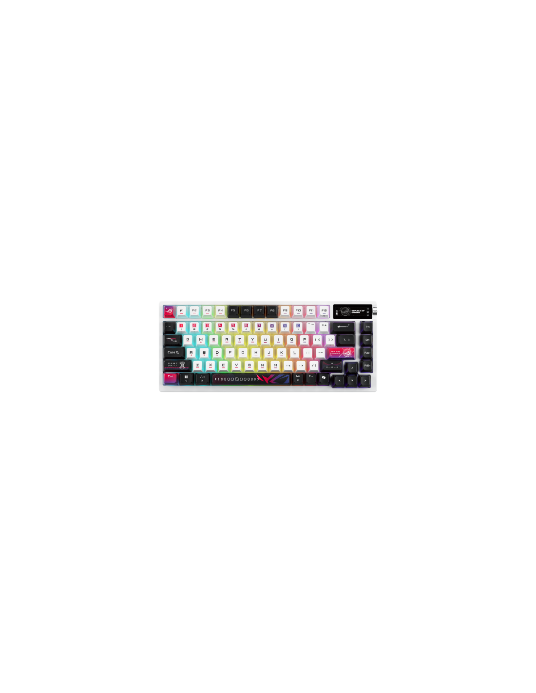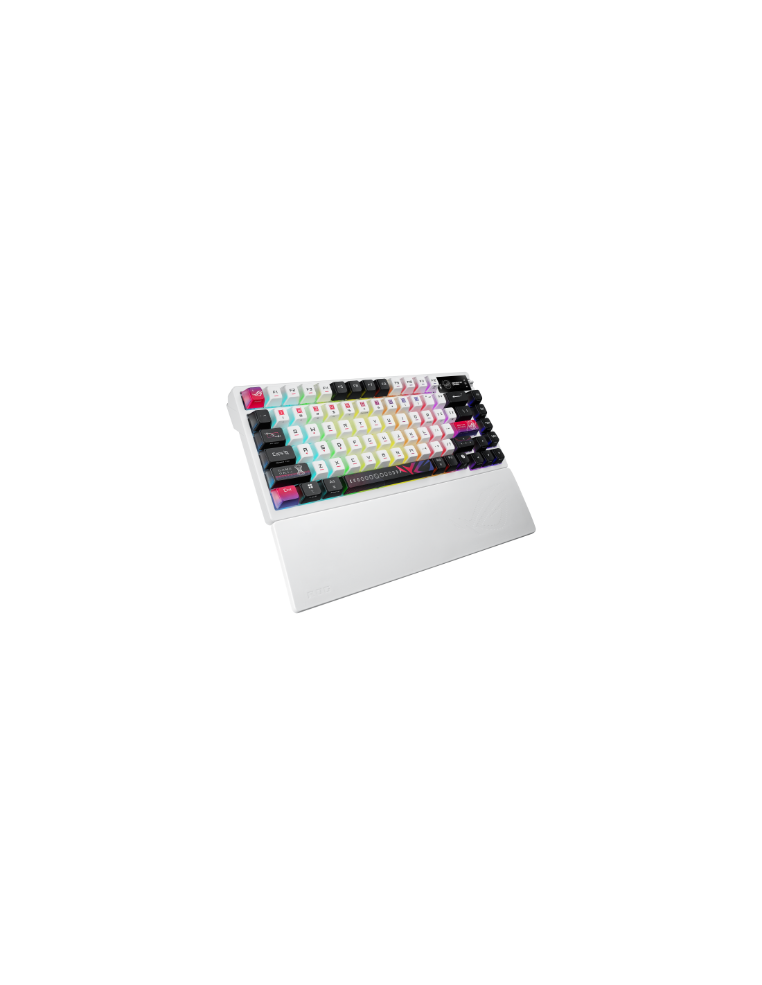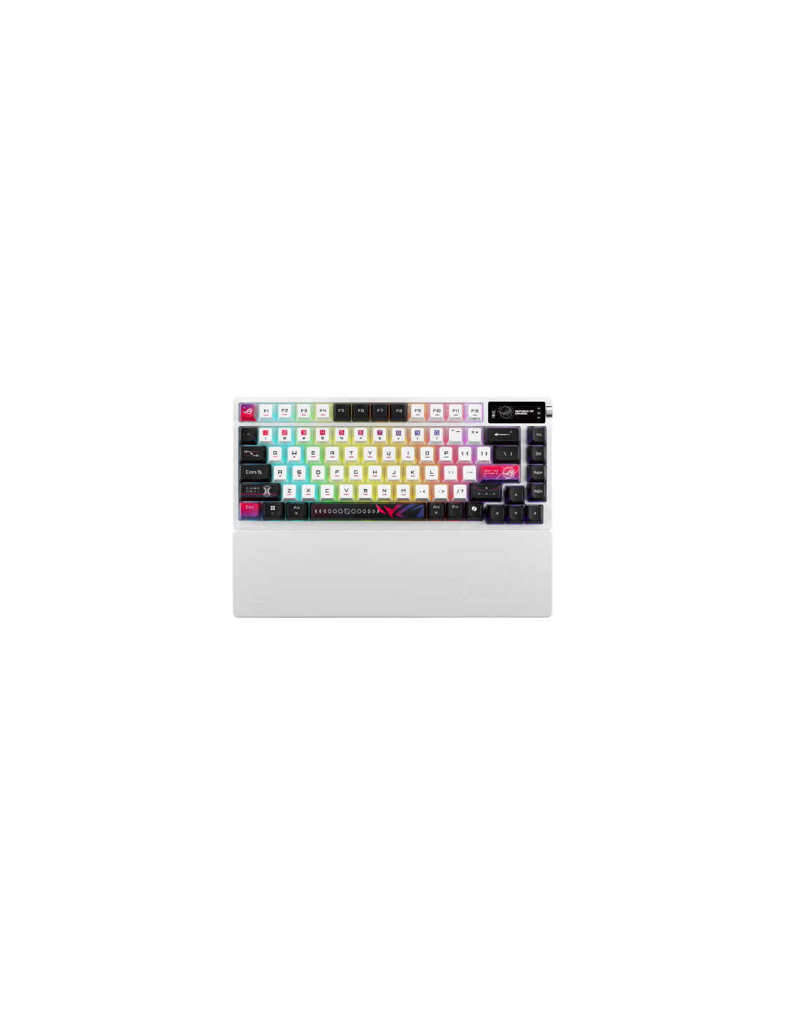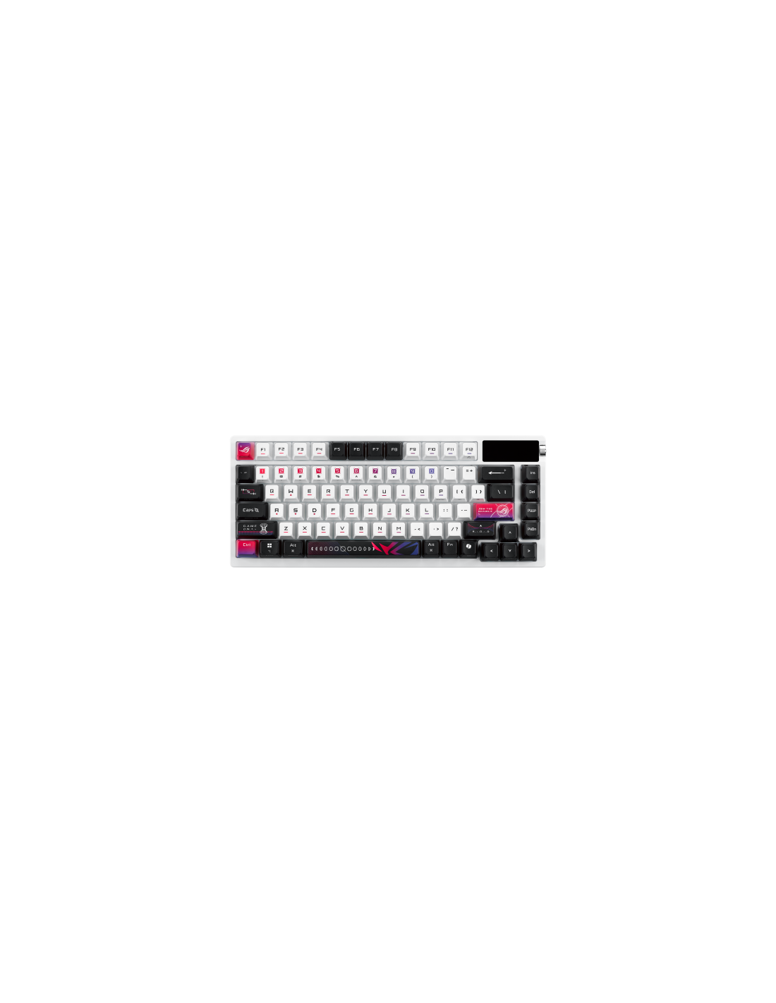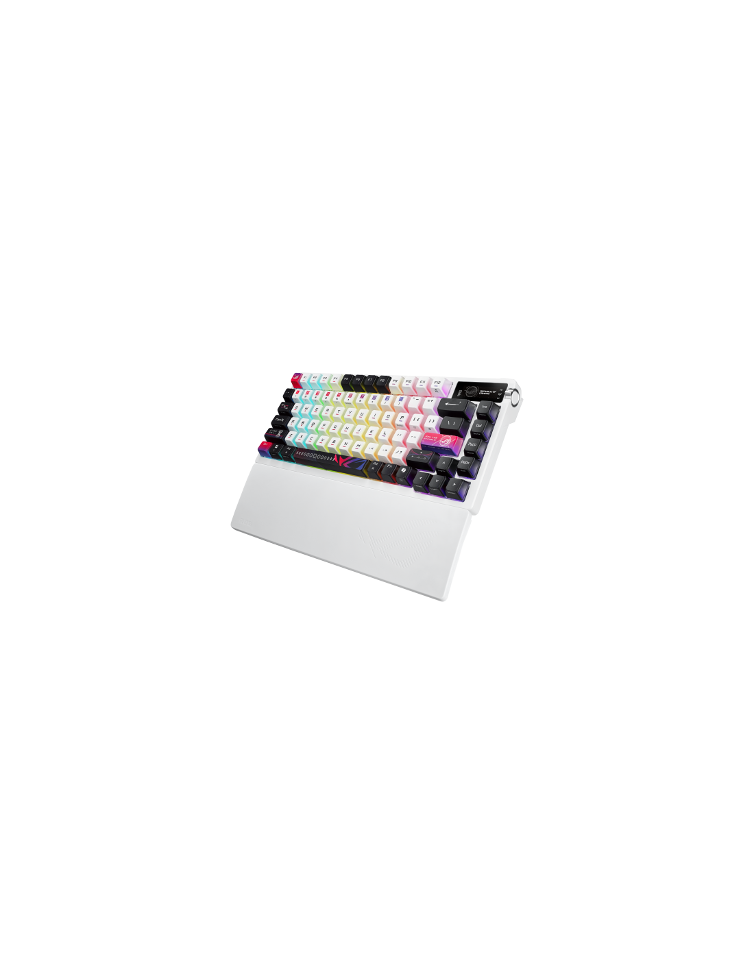 Teclado para juegos ROG Azoth X 75% personalizado con interruptores mecánicos ROG NX V2 intercambiables en caliente, teclas sublimadas y semitranslúcidas, cubierta superior de metal, montaje de junta, espuma amortiguadora de cinco capas, placa de posicionamiento FR4, PCB orientada al sur, conexión de tres modos con tecnología SpeedNova de 2,4 GHz, pantalla OLED, perilla de control de tres vías, reposamuñecas, tres ángulos de inclinación y compatibilidad con Mac