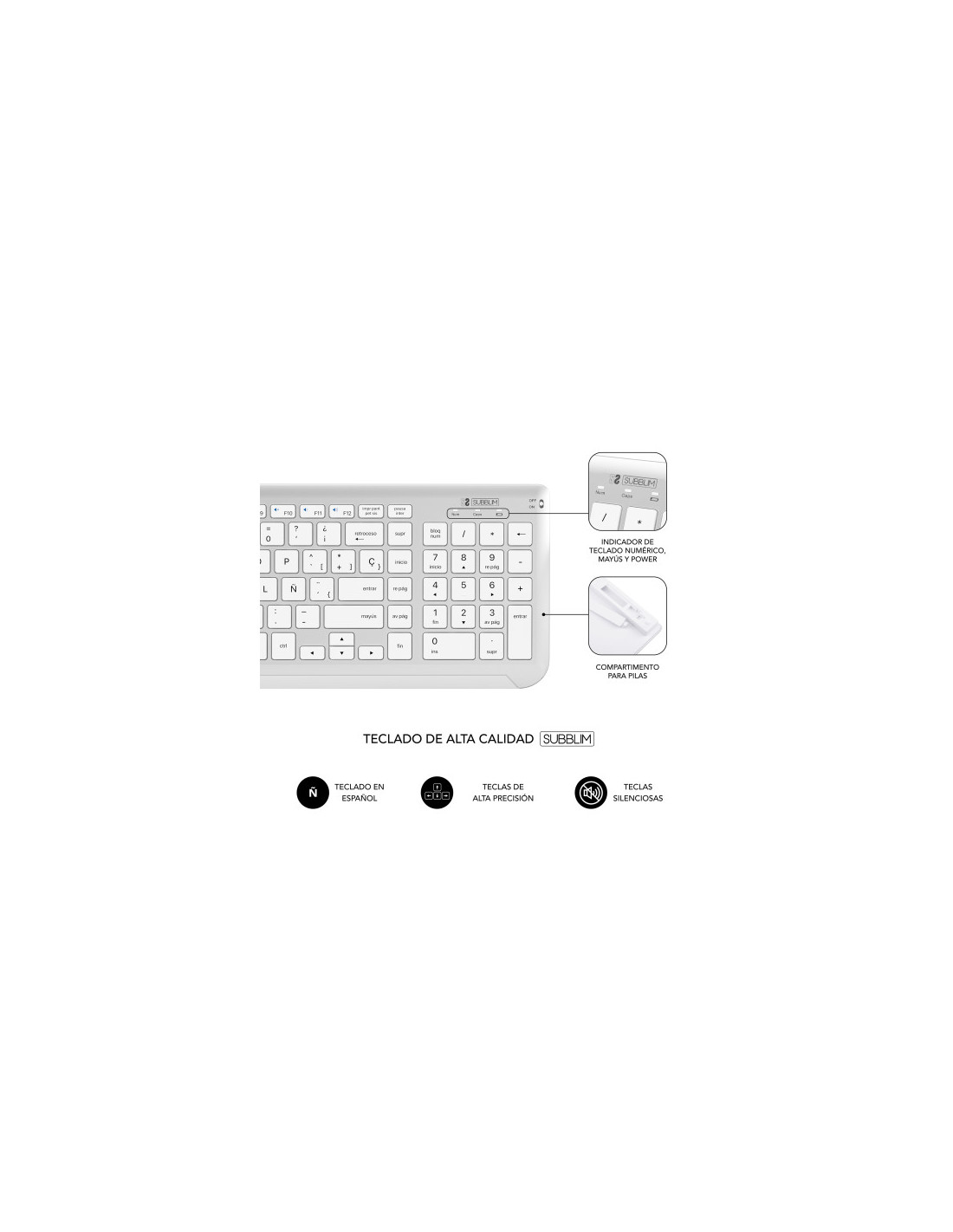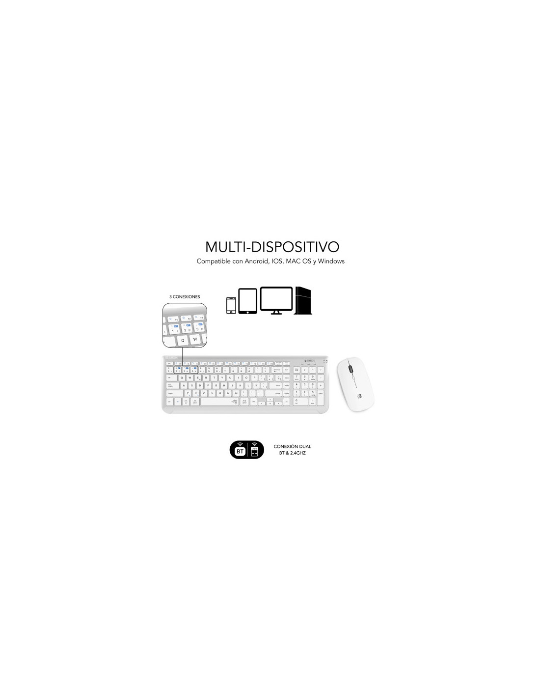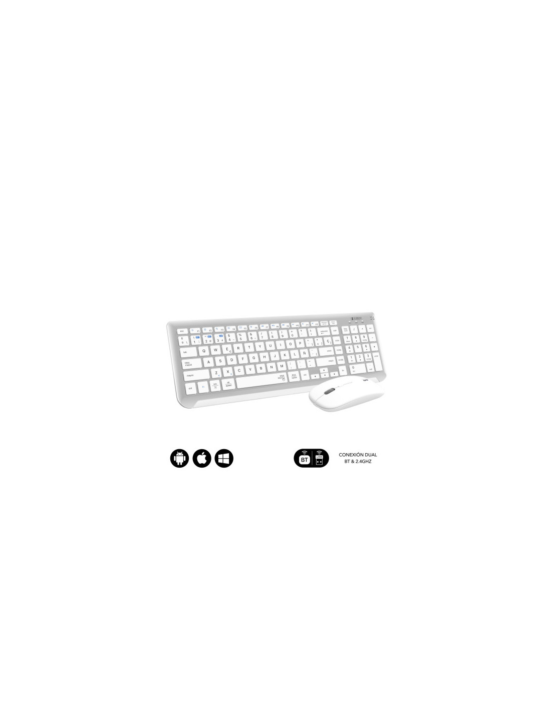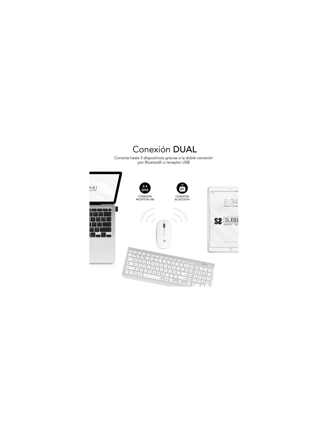 Crea un espacio minimalista, moderno y silencioso con la compacta combinación con tecnología inalámbrica Bluetooth y además por radio frecuencia 2.4G. El Combo Multidispositivo de Subblim, compuesto de un teclado extendido y un ratón de diseño avanzado de alta precisión de hasta 1600DPI, son perfectos para hacer las tareas con eficacia y permite una productividad constante.El tamaño de la combinación facilita el trabajo en los espacios de escritorio más reducidos y resulta la pareja perfecta para usarlos cuando estás de viaje o en reuniones de trabajo.Triple conexión. El Combo de Subblim es ideal si deseas disfrutar de la libertad de trabajar con varios dispositivos a la vez. Su funcionalidad de emparejamiento triple le permite conectar hasta tres dispositivos al teclado, dos mediante tecnología inalámbrica Bluetooth y otro mediante radio frecuencia 2.4G. Podrás conectar de forma simultánea el Ordenador portátil, el teléfono móvil y la Tablet cambiando entre ellos de una forma muy sencilla.Práctico Control. Con doce teclas de funciones multimedia*, tendrás accesos directos a tus funciones favoritas al alcance de tu mano. Cambia fácilmente entre las funciones más utilizadas para cada sistema operativo, ya sea a tu PC con Windows, iPhone o dispositivo Android. Tendrás acceso rápido a los controles del dispositivo para iOS y Android, como el botón de inicio, activar la función de búsqueda, tomar instantáneas, controlar tus medios o bloquear tu dispositivo. *La compatibilidad de las teclas de función varía según el sistema operativoDiseño ergonómico y silencioso. El mecanismo de tijera de las teclas hace que escribir sea cómodo y muy receptivo. El ángulo del teclado proporciona soporte para la muñeca para un trabajo sin dolor durante largos períodos de tiempo. El mouse silencioso y su clic muy suave garantizan un ambiente tranquilo y sereno.Estilo elegante y compacto con sección numérica. Las teclas son planas y elegantes (estilo Mac). Con una sección numérica integrad