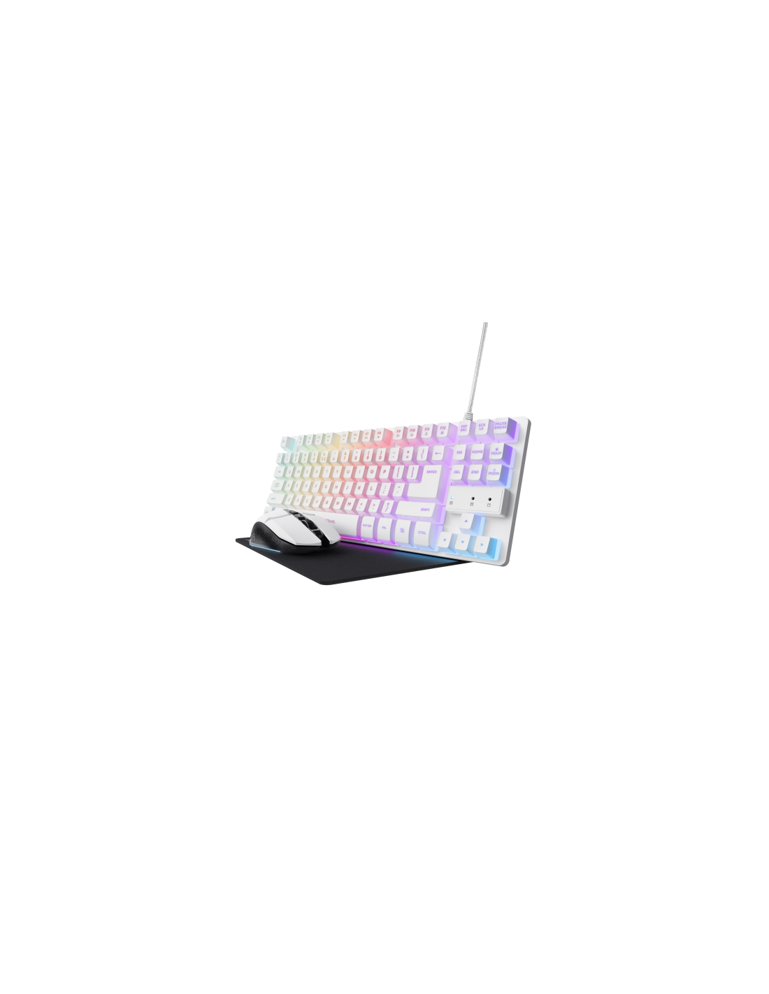 Trust GXT 794W. Formato del teclado: Tenkeyless (sin zona numérica) (80 - 87%). Estilo de teclado: Derecho. Tecnología de conectividad: Alámbrico, Interfaz del dispositivo: USB, Diseño de teclado: QWERTY. Tipo de retroiluminación: LED RGB. Longitud de cable: 1 m. Uso recomendado: Juego. Color del producto: Blanco. Ratón incluido